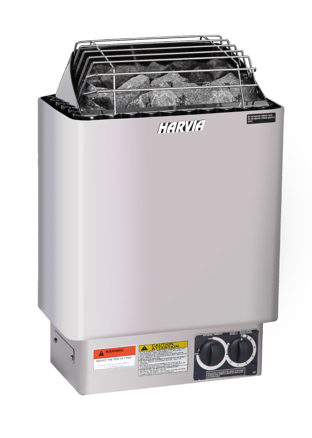 The Harvia KIP heater is a traditional wall-mounted sauna heater with built-in controls. The heater is constructed with stainless steel and includes a protective stone guard. The heater has a large stone cavity for maximum heat release, and the dual wall construction allows the exterior to remain cool to the touch. The left dial controls the temperature and the right dial is the on/off control along with a delay timer. You can set the heater to turn on up to 8 hours after it is set, and the heater will automatically shut off after 60 minutes of operation.
